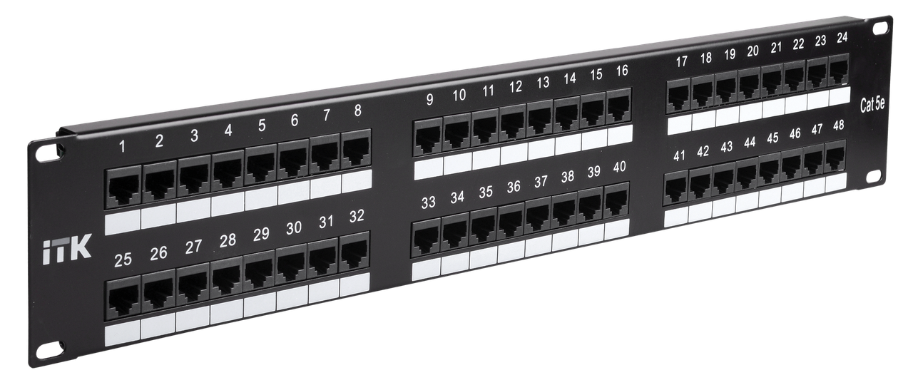 Комутаційні панелі або патч-панелі є найважливішою частиною будь-якої СКС і IT-інфраструктури будівлі та споруди з великою кількістю інформаційних розеток і термінальних портів кінцевих користувачів, які необхідно комутувати на порти активного мережевого обладнання, розміщеного в серверних і розподільних вузлах. Залежно від способу кріплення, масштабності кабельної системи, типу мережі ITK виготовляє патч-панелі для настінного монтажу або монтажу в 19-дюймовий конструктив, за кількістю портів 12-, 24-, 48-, 50-портових категорій, 3 (телефонні), 5E, 6, 6 A з кабельним організатором або без нього. Патч-панелі для монтажу в 19" шафу або стійку відповідають стандарту 19" (482,6 мм), мають отвори з лівого та правого боку для кріплення на профіль, виробляються заввишки 1 або 2 юніти. На передній стороні всі патч-панелі ITK мають спеціальний майданчик для додаткового маркування та цифрову нумерацію портів, на зворотному боці модулі IDC мають колірну та цифрову нумерацію. Також для полегшення монтажу та укладання кабелів є вироби з кабельним органайзером спереду або ззаду. Усі патч-панелі ITK категорії 5Е UTP відповідають міжнародним стандартам UL 1863, ISO/IEC 11801:2002, TIA/EIA-568-B, кодування провідників ззаду відповідно до T568B і A. Випускаються двох модифікацій: з кабельним організатором і без нього, мають спереду майданчик для додаткового маркування, постачаються в картонній коробці з кріпленням. Відповідність міжнародним стандартам і ГОСТ Р. Монтаж як на стіну, так і на 19” профіль. Подвійне зрозуміле маркування IDC-модулів і портів. Розширений частотний діапазон роботи. Виконання з екранованим захистом і кабельним органайзером. Збільшена кількість циклів увімкнення-вимкнення. Сумісні з усіма 19" шафами та стійками ITK. Підходять для кабелів і патч-кордів діаметром 22-26 AWG усіх виробників. Застосовні для мереж ISDN, 10baseT, 100 baseT, 1000baseT, EIA RS 232/485, 155 Mbit ATM, Token Ring. Технічні характеристики